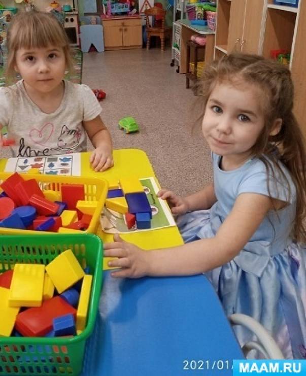 Задача малышей — подобрать к картинке детали-блоки определённого цвета, размера и формы