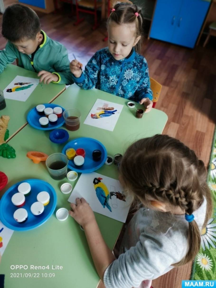 Воспитатель говорит, что сегодня они будут рисовать попугаев: