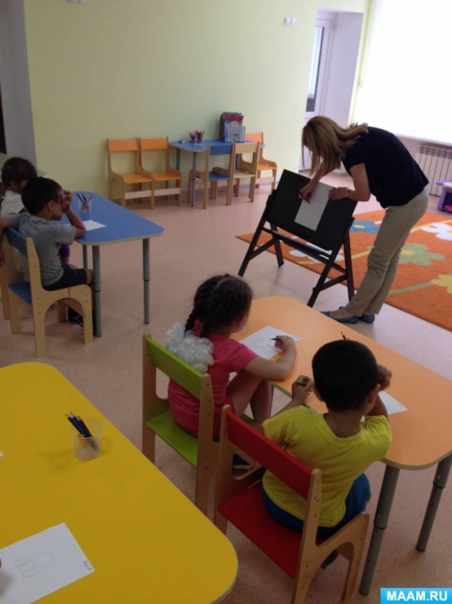 Представляем шар, который усиленно прижимают к какой-либо поверхности. Такая фигура будет у глаз. Рисуем мы их на верхней части листа и между серединами их верхних частей проводим дугообразную линию. Отступаем от глаз около сантиметра и рисуем дугу – рот.